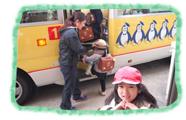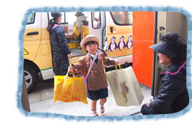 送迎バス5台、1台あたり2コース程度。 園児は、指定の号車にて登園します。 歩きの園児は、8:30~9:30までに登園。 登園順に自由時間。