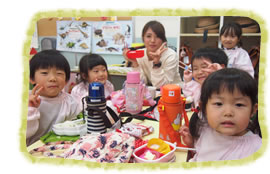クラス別に楽しい給食またはお弁当です。 そのあとは自由時間を楽しんで過ごします。